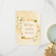 Tarjeta de agradecimiento para una despedida de soltera de verano. Fondo amarillo, blanco con un patrón de panal de abeja. Con un marco geométrico de falso oro. Decorado con flores tropicales de color amarillo claro y crema, hibisco y abejas felices. Con el texto: Gracias y Novia por venir escrito con un estilo de letra manuscrita moderna. Plantilla para el nombre de la novia y la fecha de la celebración. Letras marrones.