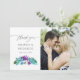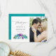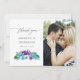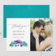 Tarjetas de agradecimiento de boda con hojas tropicales y orquídeas en acuarela colorida con lavado de acuarela azul turquesa en el reverso.