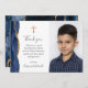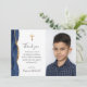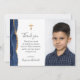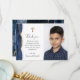 Esta elegante tarjeta moderna de agradecimiento para la Primera Comunión presenta un borde de ágata de acuarela azul recortado con brillo dorado falso. Una pequeña cruz de lámina dorada falsa aparece sobre las palabras "Gracias" en escritura a mano gris carbón sobre un fondo blanco. Edite el texto con su mensaje personal, agregue el nombre de su hijo en escritura a mano y reemplace fácilmente la imagen de muestra con una foto de su hijo. El reverso de la tarjeta presenta un diseño de ágata azul y dorado a juego.