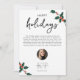 Un hermoso diseño que incorpora 1 de tus propias fotos y tu código QR. Esta elegante tarjeta de vacaciones para Navidades inmobiliarios es ideal para todos los inquilinos que contacten con sus propietarios durante la temporada de vacaciones. Una forma sencilla y profesional de promocionar su negocio y dar las gracias a sus clientes. Una tarjeta de Navidad perfecta para agentes inmobiliarios, corredores, etc. Personalice sus detalles para crear su propia tarjeta de visita única.