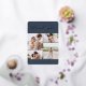 Las elegantes tarjetas de agradecimiento para bodas cuentan con cuatro fotos dispuestas en un diseño de collage en un rico fondo azul marino. "Gracias" aparece en la parte superior del guión de caligrafía de Relieve metalizado dorado de moda, con sus nombres a lo largo de la parte inferior en letras de bloques clásicas. Añadir un mensaje personal y una firma al reverso.
