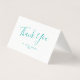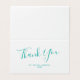 Una simple tarjeta de agradecimiento al boda que incluye la frase "gracias" en letra verde azulada con letras a mano, y sus nombres y fecha boda en letra sans serif moderna. La tarjeta está en blanco dentro para tu propio mensaje escrito a mano.