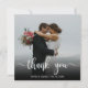 Tarjeta De Agradecimiento A Boda De Caligrafía Leída Por Mano Moderna. Modern Stylish boda gracias a la plantilla de tarjeta que incluye una foto cuadrada completa en el frente con el texto "Gracias" en una letra manuscrita de escritura tipográfica en blanco en la imagen. Personaliza tu nombre y mensaje de agradecimiento. Si prefiere escribir a mano la nota, simplemente elimine el texto de ejemplo para hacer más espacio. Si necesita ayuda o un elemento que coincida, por favor, póngase en contacto conmigo.