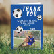 Tarjeta de agradecimiento al entrenador de fútbol azul. Tarjeta de agradecimiento al entrenador de fútbol con foto, texto de agradecimiento, nombre del entrenador, nombre del equipo, año, tu nombre y balones de fútbol. Dentro de la tarjeta hay más balones de fútbol. Tarjeta de agradecimiento con foto - añade tu foto al template. Personaliza la tarjeta con nombres y tu texto.