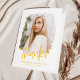 Tarjeta de agradecimiento moderna y de moda para graduación que incluye la foto del graduado dentro de un marco de máscara texturizada con "¡Gracias!" en un guión manuscrito amarillo. Personalice la parte delantera de la tarjeta de agradecimiento de graduación agregando el nombre del graduado y el año de graduación. El interior de la tarjeta incluye espacio para su mensaje de agradecimiento escrito a mano o con tipeo.
