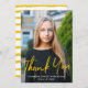 Tarjeta de agradecimiento para graduación moderna que incluye la foto del graduado con "Gracias" en letras de pincel amarillo. Personalice la parte delantera de la tarjeta de agradecimiento de graduación con fotos agregando el nombre del graduado y el año de graduación. En la parte posterior de la tarjeta hay espacio para el mensaje de agradecimiento escrito a mano o con tiras de color amarillo y blanco.