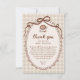 Celebra a la novia con esta Tarjeta de Agradecimiento para Bridal Shower de Café Gingham "Love is Brewing". Con un latte de acuarela coronado con arte de espuma en forma de corazón, granos de café y un marco vintage de borde ondulado sobre un cálido fondo de gingham beige, este diseño inspirado en un acogedor café aporta encanto rústico a la papelería de tu bridal shower. Perfecta para expresar gratitud a los invitados, esta tarjeta de agradecimiento editable combina perfectamente con las invitaciones y decoraciones de fiesta "Love is Brewing" coordinadas.