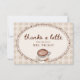 Celebra a la novia con esta Tarjeta de Agradecimiento para Despedida de Soltera de Café Gingham "Love is Brewing". Con un latte de acuarela coronado con arte de espuma en forma de corazón, granos de café, "Gracias a montones" en caligrafía de moda, y un marco vintage de borde ondulado sobre un fondo de gingham beige cálido, este diseño inspirado en un acogedor café aporta encanto rústico a la papelería de tu despedida de soltera. Perfecta para expresar gratitud a los invitados, esta tarjeta de agradecimiento editable combina perfectamente con invitaciones y decoraciones de fiesta "Love is Brewing" coordinadas.
