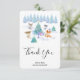 Gracias tarjeta con una escena de Navidades caprichosos. Felices animales del bosque bailando alrededor de un árbol de Navidad decorado. Diseño acuático festivo.