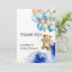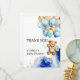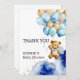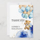 Muestre su aprecio con estilo con esta adorable tarjeta de agradecimiento temática "We Can Bearly Wait" (Apenas podemos esperar), la manera perfecta de agradecer a los invitados por celebrar a su pequeño. Con un dulce oso de peluche pintado a mano, elegantes acentos de acuarela en azul real y dorado, y globos juguetones dorados marrones y azules, esta tarjeta añade un toque cálido y personal a su gratitud.