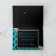 Precioso azul acuático con un damasco negro superpuesto sobre un fondo negro. Un borde de gema en forma de diamante curvado con un adorno negro con corte floral y parecido a un diamante.