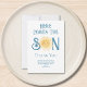 Esta tarjeta de agradecimiento a los bebés de este lindo muchacho incluye el texto "Here Comes The Son" (Aquí viene el hijo) en una tipografía retro azul con un sol de color amarillo sonriente en color de agua. Personalizable fácil. Acuarela original © Michele Davies.