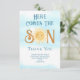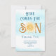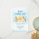 Esta tarjeta de agradecimiento a los bebés de este lindo muchacho incluye el texto "Here Comes The Son" (Aquí viene el hijo) en una tipografía retro azul con un sol color amarillo de agua, nubes y cielo azul. Personalizable fácil. Porque creamos nuestra obra de arte no encontrarás esta imagen exacta de otros diseñadores. Acuarela original © Michele Davies.