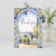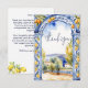 Tarjeta de agradecimiento para despedida de soltera con arco de azulejos italianos mayólicas azules con limones, arco de azulejos azules pintados a mano con acuarela y cítricos con paisaje italiano en el fondo, tema de colores azul marino, blanco y amarillo.