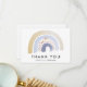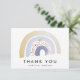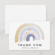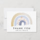 Tarjetas modernas de agradecimiento con arcoíris que presentan un arcoíris en acuarela en tonos de azul, marrón y dorado con "Gracias" mostrado debajo en letra negra. Personalice la tarjeta de agradecimiento del arcoíris agregando su nombre o texto personalizado. La parte posterior de la tarjeta está en blanco con mucho espacio para su mensaje de agradecimiento mecanografiado o escrito a mano. La tarjeta de agradecimiento del arcoíris en acuarela es perfecta para usar en baby showers, fiestas de cumpleaños y más.