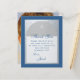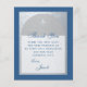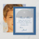 Una tarjeta de agradecimiento de primera comunión azul para un niño. Sobre un fondo rectangular azul clásico, tiene un arco de falso foil plateado que tiene dentro texto azul sobre fondo blanco. Las palabras "Gracias" y el nombre están escritos en una elegante letra caligráfica; el resto en mayúsculas.