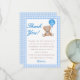 "Muestra tu gratitud con esta elegante tarjeta azul de agradecimiento 'We Can Bearly Wait'. Con un dulce oso de peluche y un suave diseño de gingham azul, esta tarjeta es la manera perfecta de agradecer a sus invitados por celebrar la llegada de su pequeño. El encantador y juguetón diseño le da un toque personal y sincero a su mensaje de apreciación".