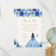 Esta elegante y glamurosa tarjeta de agradecimiento de dulce dieciséis presenta a una hermosa princesa con cabello oscuro y piel oscura en un vestido de gala azul. El texto combina letra manuscrita y fuentes sans serif modernas para un look clásico y sofisticado. Las disposiciones florales, las mariposas y el confeti dorado crean la mezcla perfecta de rústico y chic.