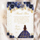Esta elegante y glamurosa tarjeta de agradecimiento de Quinceañera presenta a una hermosa princesa con cabello oscuro en una tiara y un vestido de gala azul marino. El texto combina letra manuscrita y fuentes modernas sans serif para un aspecto clásico y sofisticado. Los arreglos florales y el confeti dorado crean la mezcla perfecta de rústico y chic.