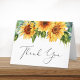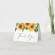 Tarjeta de agradecimiento doblada para baby shower rústico. La parte delantera presenta ramos de acuarela de flores de girasol y follaje de eucalipto y "Gracias" en una elegante caligrafía. En el interior, personalice su mensaje de agradecimiento y agregue su nombre en una escritura similar a una firma, o déjelo en blanco para una nota escrita a mano.