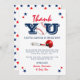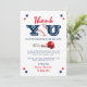 Una moderna tarjeta de agradecimiento para una ducha de bebé con temática de béisbol, con un fondo blanco clásico, una moderna tigrafía azul marino y roja, un béisbol, estrellas, un casco con bate y bola y una ducha deportiva de agradecimiento fácil de personalizar.