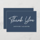 Simple tarjeta de agradecimiento para una ducha de bebé con "Gracias" mostrada en la parte delantera en un audaz guión blanco con fondo marino. Personalice la parte delantera de la tarjeta con su nombre o texto personalizado. En la parte posterior de la tarjeta de agradecimiento de la marina se muestra el mensaje y los nombres de su personalizado.