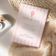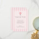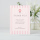 Tarjeta de agradecimiento a la ducha de bebé con un fondo rayado rosa pastel combinado con un globo de aire caliente dibujado a mano y un elegante tipo de letra serif en la que se escribe tu información personalizada. Puede encontrar más productos de esta colección en nuestra tienda.