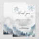 Bebé rústico y moderno, hace frío fuera del tema de la ducha de bebé de un niño, tarjeta de agradecimiento con acuarela de ilustracion de una montaña nevada con pinares y copos de nieve azules. El mensaje da las gracias a los clientes por venir a la ducha y por sus regalos.