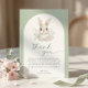 Expresa tu gratitud con un toque de encanto rústico y dulzura caprichosa. Esta hermosa tarjeta de agradecimiento presenta una encantadora ilustración de un conejito bebé entre delicadas flores, enmarcado por un diseño suave y arqueado. Los tonos verdes y crema naturales le dan un toque suave y terrenal, perfecto para agradecer a los invitados que celebraron a tu "conejo pequeño en camino".