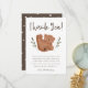 Tarjeta de agradecimiento de baby shower con tema de oso lindo con ilustración de un oso cachorro con vegetación en ambos lados. El mensaje agradece a los invitados por venir al shower y por sus regalos. Perfecto para un shower en otoño.