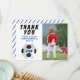 Tarjeta de agradecimiento de cumpleaños de fútbol con foto, mensaje de agradecimiento, nombre y un balón de fútbol. En la parte posterior de la tarjeta hay rayas azules. Agrega tu foto al modelo. Personaliza la tarjeta con tu nombre y tu texto. Ideal para niños que aman el fútbol y el deporte.