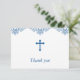 Esta tarjeta clásica tradicional de agradecimiento para un bautismo o bautismo masculino presenta una cruz azul y un diseño azul decorativo a lo largo de la parte superior de la tarjeta plana. Los mensajes en la parte delantera y en la parte posterior se pueden personalizar.