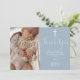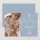 Esta tarjeta de agradecimiento de bautizo con letra elegante azul polvoriento puede ser personalizada con tu foto especial y mensaje de agradecimiento en tipografía chic. Diseñada por Thisisnotme©