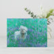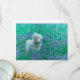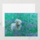 Tarjeta plana que incluye obra de arte dibujada a mano de un bichon frise en un campo de lupinos azules. Obra de arte: Lápiz de color. Derechos de autor: Dominic A. White. Todos los derechos reservados.