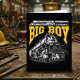 Supporting the main image is the strong, structured “BIG BOY” title rendered in vivid athletic gold. Above it, a smaller side-profile silhouette of the locomotive and tender offers perspective on the scale of this mechanical titan. A clean footer anchors the design with historical reference to its class and service years from 1941 to 1959. The composition blends raw industrial might with a crisp graphic layout, capturing the spirit of the “King of Steam” in all its commanding presence.