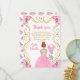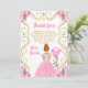This birthday party thank you card features an elegant gold frame, a beautiful princess with red hair and a pink dress, flowers and a balloon. This is perfect for a birthday party.
