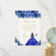 Esta elegante y glamorosa tarjeta de agradecimiento de cumpleaños presenta una hermosa princesa con el pelo de morena y piel clara en un vestido de bolas azul real. El texto combina el guión manuscrito y las fuentes sans serif modernas para un aspecto elegante y sofisticado. Los arreglos florales, las mariposas y los confeti dorados crean una perfecta mezcla de rústico y moda. Gráficos de www.etsy.com/uk/shop/SunflowerDayLove