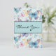 Envía estas tarjetas de agradecimiento de mariposas caprichosas y románticas a tus invitados para agradecerles por ser parte de tu día especial de boda. La parte delantera de la tarjeta presenta un diseño de mariposa en tonos azules y púrpuras, que se ajusta al tema de un fondo azul claro y mariposas acuarelas etéreas. Complementado con tipografía moderna como un Agradecimiento. La parte trasera es personalizable con tu mensaje personal