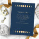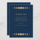 Agregue un toque de elegancia cósmica a su evento con nuestra Tarjeta de Agradecimiento de Boda Celestial. Sumérjase en la simplicidad encantadora de nuestro diseño, que refleja la magia fascinante de los cuerpos celestes. Nuestro diseño moderno pero atemporal muestra una serie de fases lunares representadas artísticamente en dorado sobre un llamativo fondo azul marino. Este toque de dorado añade un toque de calidez y encanto brillante a la base de azul medianoche fresco, lo que realza aún más el atractivo atractivo de la pieza. El diseño mantiene un enfoque minimalista, permitiendo que los elementos celestes realmente brillen. Puede personalizar fácilmente para satisfacer sus necesidades, asegurando que cada pieza refleje su estilo único.