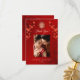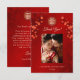 Esta tarjeta de agradecimiento tradicional de los bodas chinos incluye flores de cerezo rojas bonitos y un signo de doble felicidad dorado en un brillante fondo rojo. Con un texto personalizado de agradecimiento a tu boda, tu foto y tus nombres y fecha de boda.