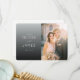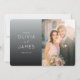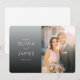 Esta tarjeta de agradecimiento de boda presenta un diseño moderno y elegante con una composición dividida. El lado izquierdo muestra un fondo degradado en tonos grises, complementado con tipografía blanca suave que añade un toque de sofisticación. A la derecha, un marcador de posición para una foto de tono cálido captura un momento alegre, realzado por un efecto de desenfoque sutil para un ambiente romántico. La disposición general equilibra el texto y la imagen sin problemas, creando un flujo visual armonioso perfecto para expresar gratitud después de una ocasión especial como una boda.