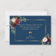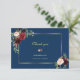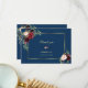 Diseño de tarjeta romántico con hermosos ramos de flores de acuarela en rubor de Borgoña, divisor floral, hermoso marco dorado falso sobre fondo azul marino; en la parte posterior las mismas flores sobre un fondo azul marino. Utilice la herramienta Personalizar para agregar su información y realizar cambios. Para artículos coincidentes, visite mi Colección de Marcos Dorados Florales de Borgoña.