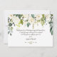 Diseño de tarjeta elegante con flores blancas delicadas de acuarela y hojas verdes, divisor floral, sobre fondo blanco. En la parte posterior flores blancas, divisor floral. Utilice la herramienta Personalizar para agregar su información, cambiar fuentes, colores de fuentes. Para artículos coincidentes, visite mi Colección de Flores Blancas Delicadas.