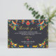 El diseño de esta tarjeta Boda de 5 de mayo de Fiesta Colorida mexicana muestra una vibrante temática de inspiración folclórica mexicana, con pájaros coloridos, flores y un motivo central del corazón. Los tonos rojos, amarillos, azules y verdes se distinguen del fondo negro profundo, lo que crea un ambiente festivo y animado. El arreglo simétrico de los pájaros y las flores añade equilibrio y armonía, perfecto para invitaciones de boda o papelería de celebración.