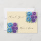 Un impresionante diseño de invitación de boda que muestra elegantes peonías Lyons azules en acuarela combinadas con ricas rosas púrpuras de higo y un suave follaje. La audaz y romántica paleta de colores hace que este diseño sea ideal para parejas que buscan un tema floral único y atemporal. Perfecto para bodas.
