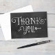 La plantilla de tarjeta de nota de boda de estilo pizarra doblada "Gracias" presenta texto estilizado con una apariencia de tiza blanca manuscrita en una imagen de fondo de estilo pizarra negra texturizada, así como un mensaje que se puede personalizar en el interior de la tarjeta.