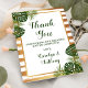 Dé las gracias con estilo con estas elegantes y muy modernas tarjetas de agradecimiento boda. El diseño presenta un fondo de Relieve metalizado blanco y dorado a rayas de moda con hojas de palma tropicales y una redacción a juego en un profundo tono verde... impresionante y simplemente perfecto para cualquier pareja que planee un destino o una celebración de bodas con temática playera. Este diseño es fácil de personalizar con la redacción de su evento especial y sus invitados estarán encantados cuando reciban estas fabulosas tarjetas.