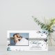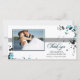 Esta elegante boda Gracias tarjeta de foto tiene un fondo blanco con un diseño floral azul acuático y negro suave en el lado superior derecho e inferior izquierdo. A la izquierda, puedes fácilmente personalizar esto con tu fotografía. En la parte inferior derecha, gracias está escrito en una moderna letra de swirl con un mensaje de agradecimiento y los nombres de la novia y el novio de abajo. Esta es una manera asequible de decir Gracias a todos sus amigos y familiares que fueron parte de su día de bodas.