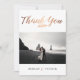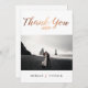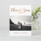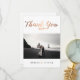 Elegante boda gracias a la plantilla de postales que incluye una foto en el frente con el texto "Gracias" en una letra de escritura moderna en oro fino y brillante. También hay un pequeño ilustracion follaje debajo del texto en oro falso. Personalizado: mensaje de agradecimiento en la parte posterior de la tarjeta. Diseño elegante y moderno.