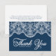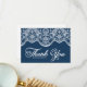 Tarjeta plana de agradecimiento elegante con encaje de brocado botánico blanco sobre fondo azul marino. Personalice añadiendo nombres, mensaje y detalles. Esta elegante tarjeta de agradecimiento es perfecta para bodas, fiestas de compromiso, cumpleaños y mucho más.